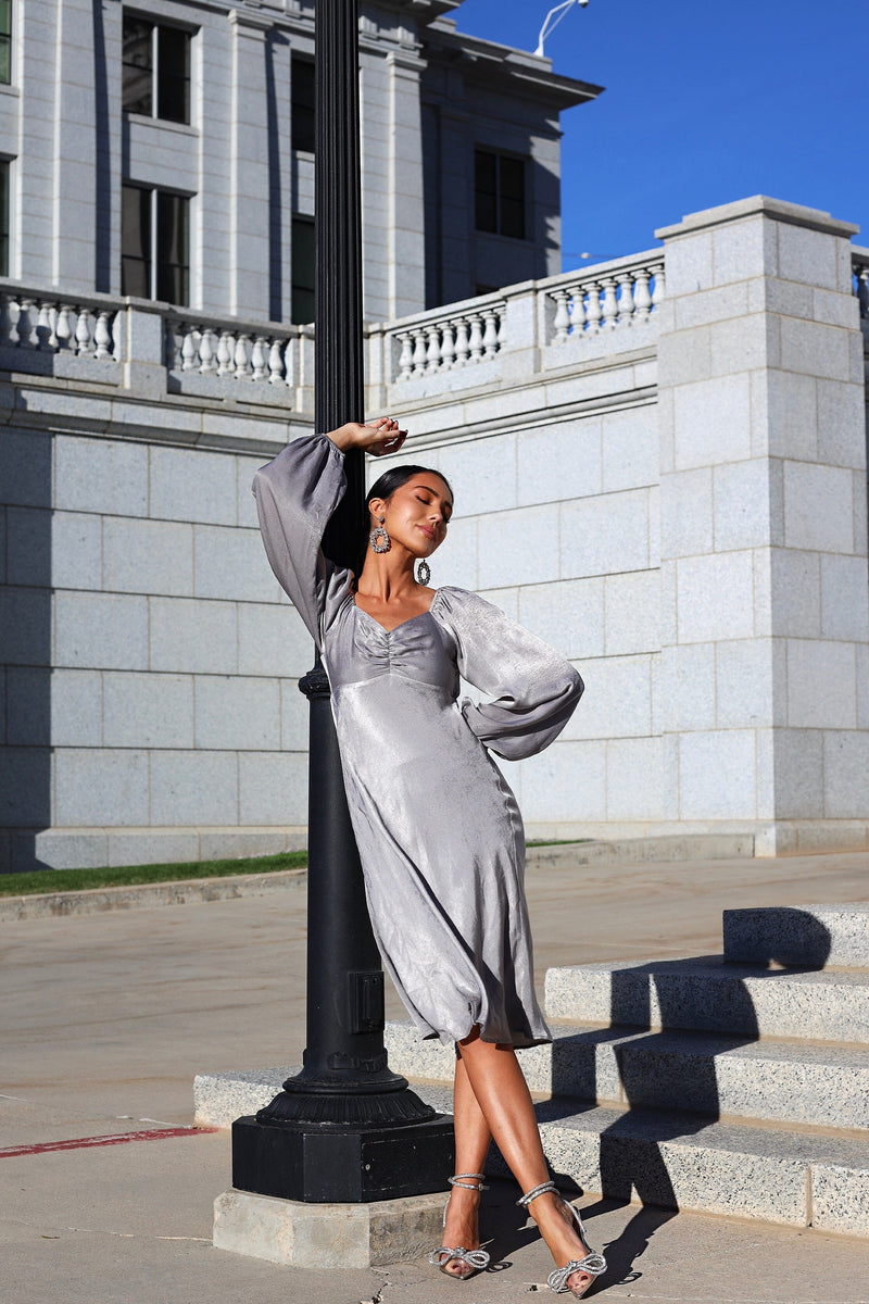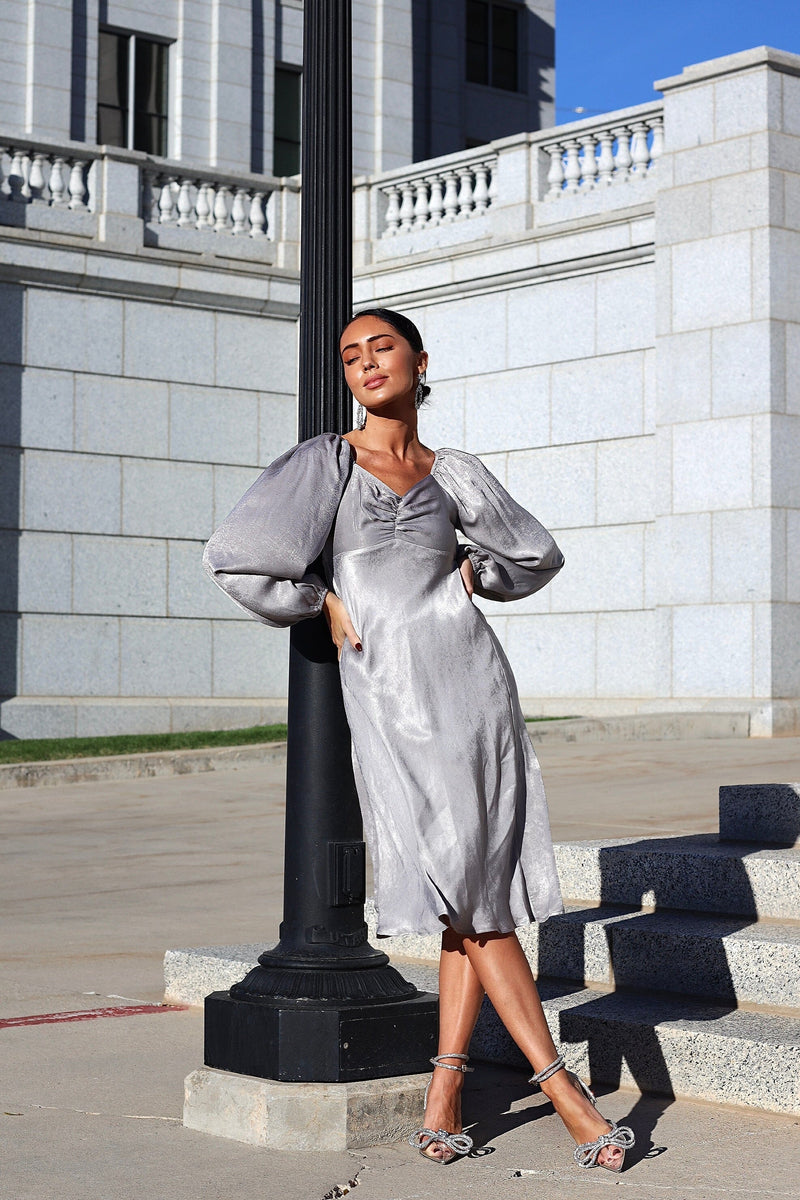 We are in love with stunning new Nellie satin dress! This gorgeous, modest, satin beauty, is a true must have! Can you say *perfect* bridesmaids dress?! Featuring a modest sweetheart neckline, flowy long sleeves, slip on style & gorgeous knee length skirt.