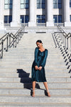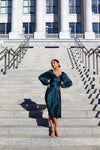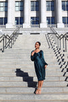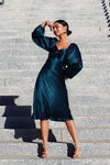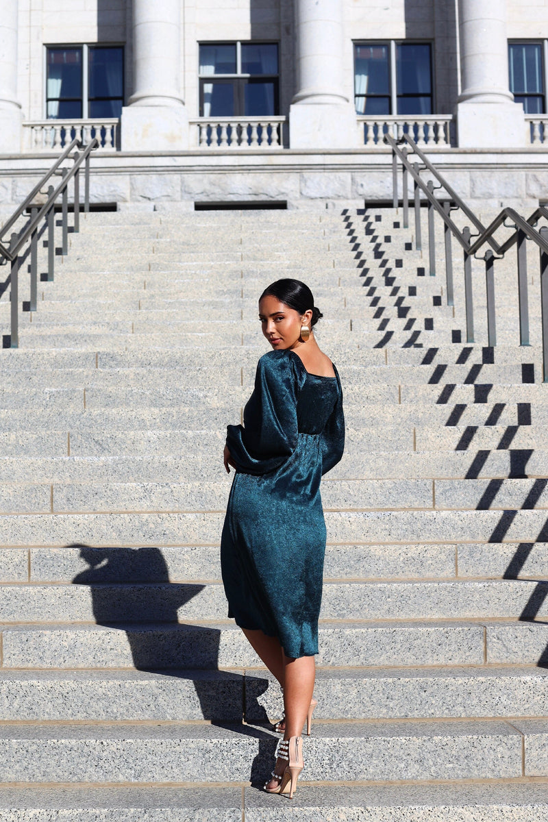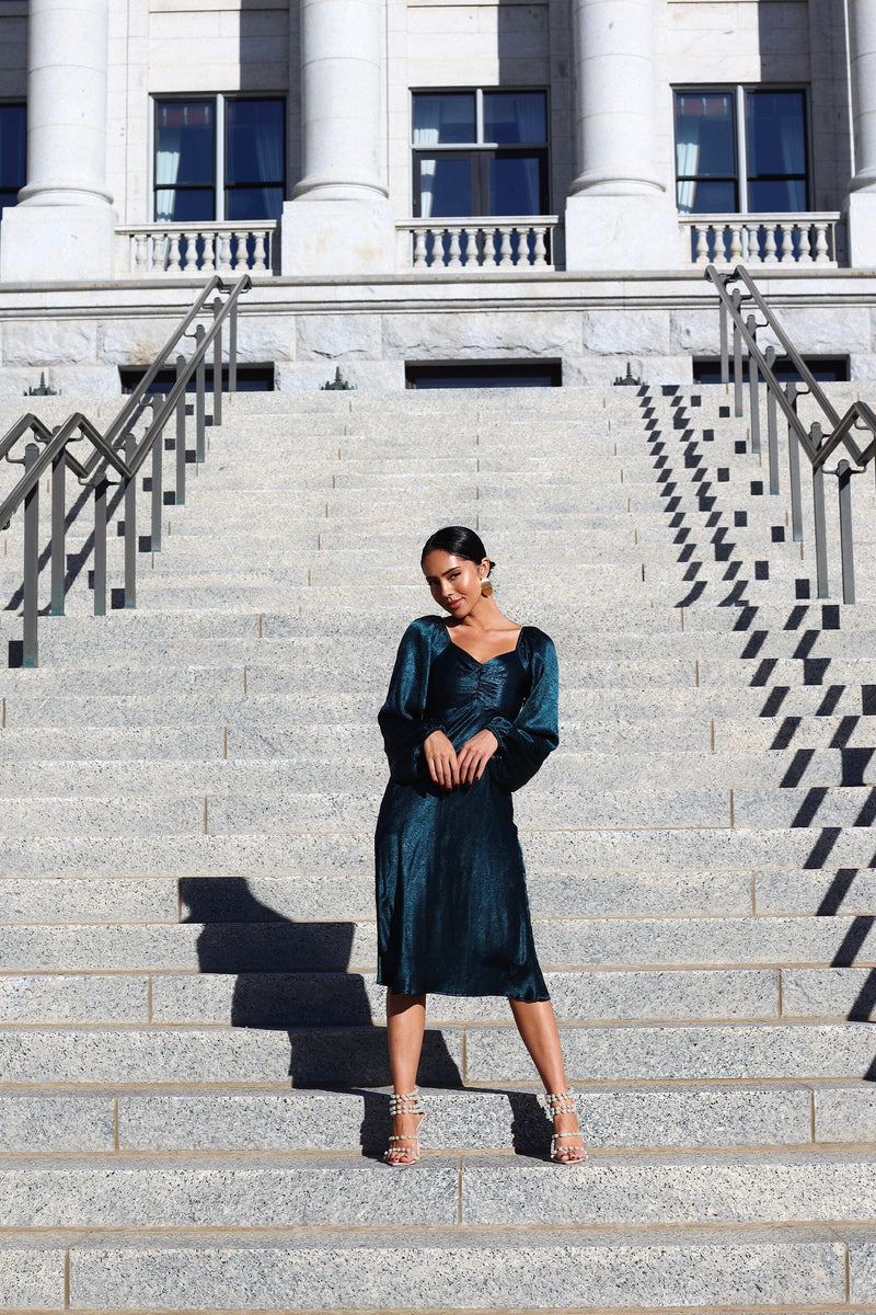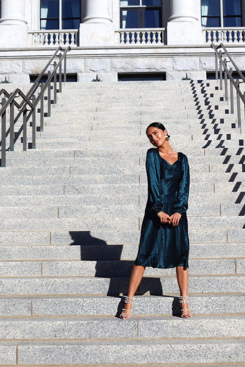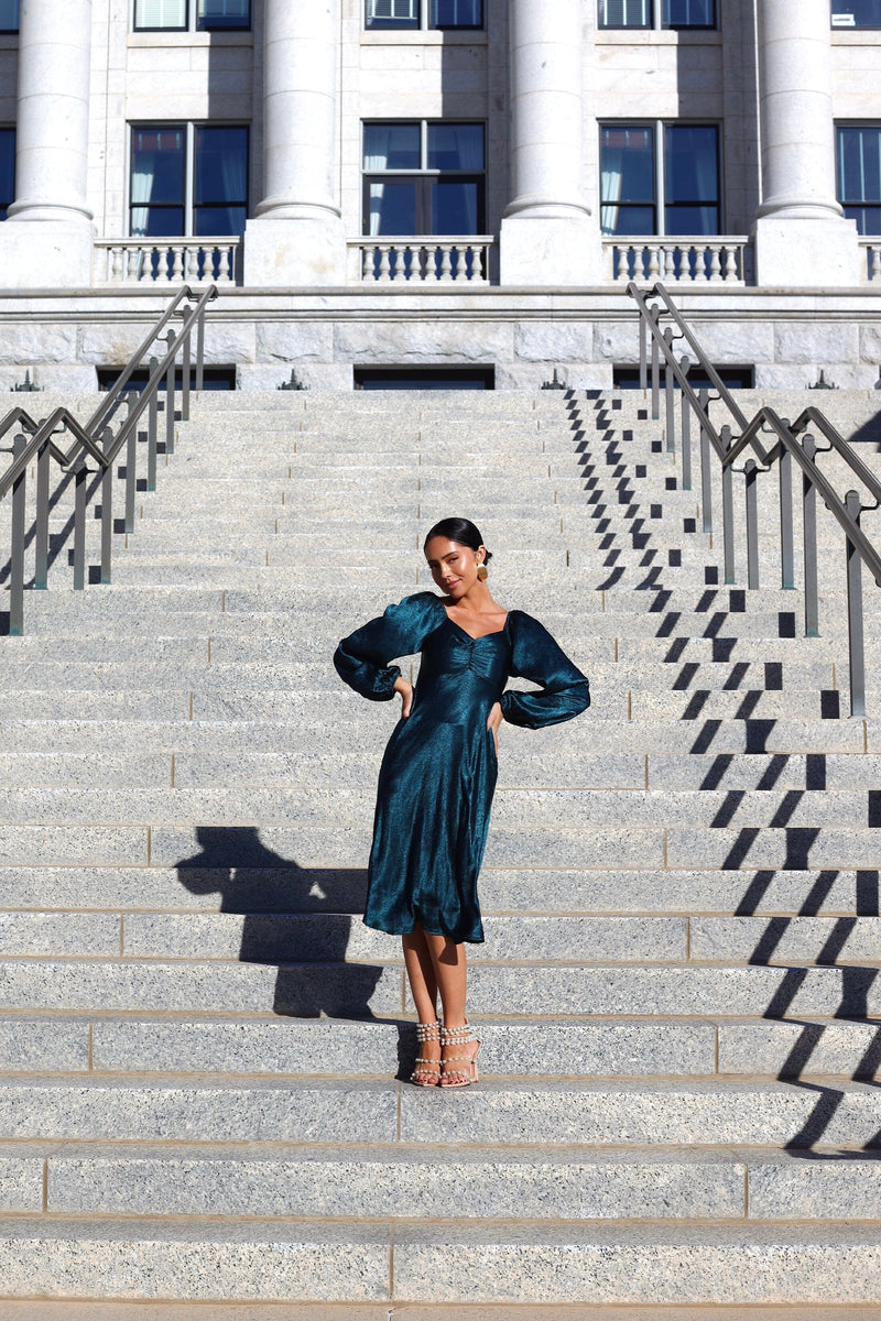We are in love with stunning new Nellie satin dress! This gorgeous, modest, satin beauty, is a true must have! Can you say *perfect* bridesmaids dress?! Featuring a modest sweetheart neckline, flowy long sleeves, slip on style & gorgeous knee length skirt.