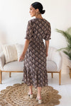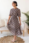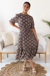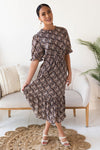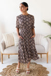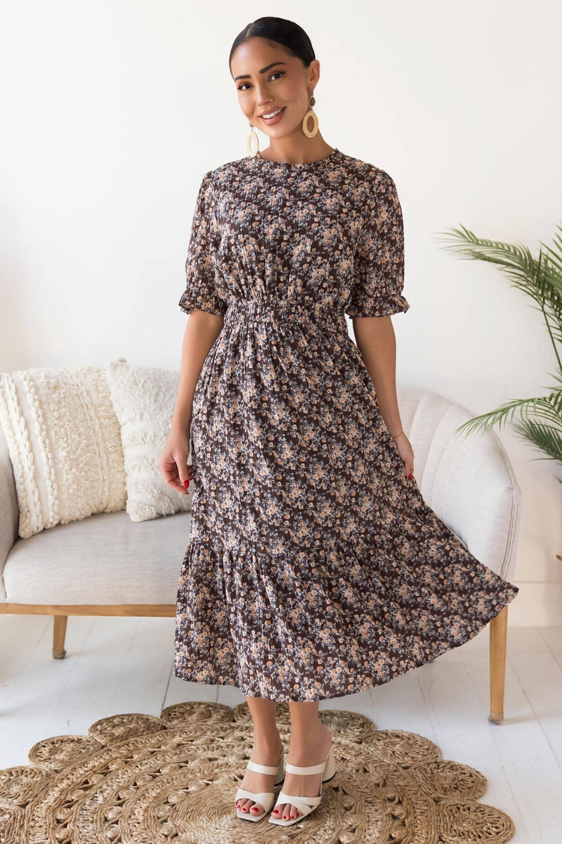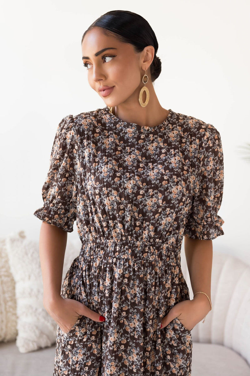 The Nevina is our newest gorgeous arrival! Featuring a crinkle brown floral fabric, classy round ruffled neckline, short ruffled puff sleeves, elastic banded waistline, pockets and the perfect length ruffle hem skirt.