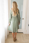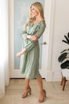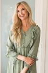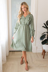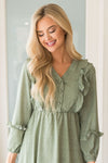 The Niamh is here and we are in love! This beautiful sage dress has dainty ivory polka dot print, an elastic waist, long sleeves with ruffle detailing and string ties at the end, and a ruffled button up V-neck bodice. This dress is a must have in your wardrobe!