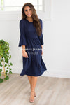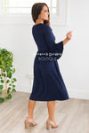 There is nothing not to love about our new Nicole Bell Sleeve Dress! This dress is so soft and comfy you will want to wear one everyday. Solid navy dress features a round neckline, 3/4 length bell sleeves, an elastic waist and side seam pockets.