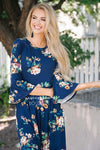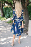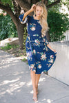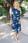 There is nothing not to love about our new Nicole Bell Sleeve Dress! This dress is so soft and comfy you will want to wear one everyday. Navy floral dress features a round neckline, 3/4 length bell sleeves, an elastic waist and side seam pockets.