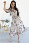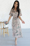 The classiest satin dress you will ever find! Featuring the softest most gorgeous taupe floral satin fabric, functional button front, classic collar, tie waist & short sleeves! These will go quickly, add to cart now before they are gone for good!