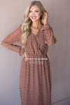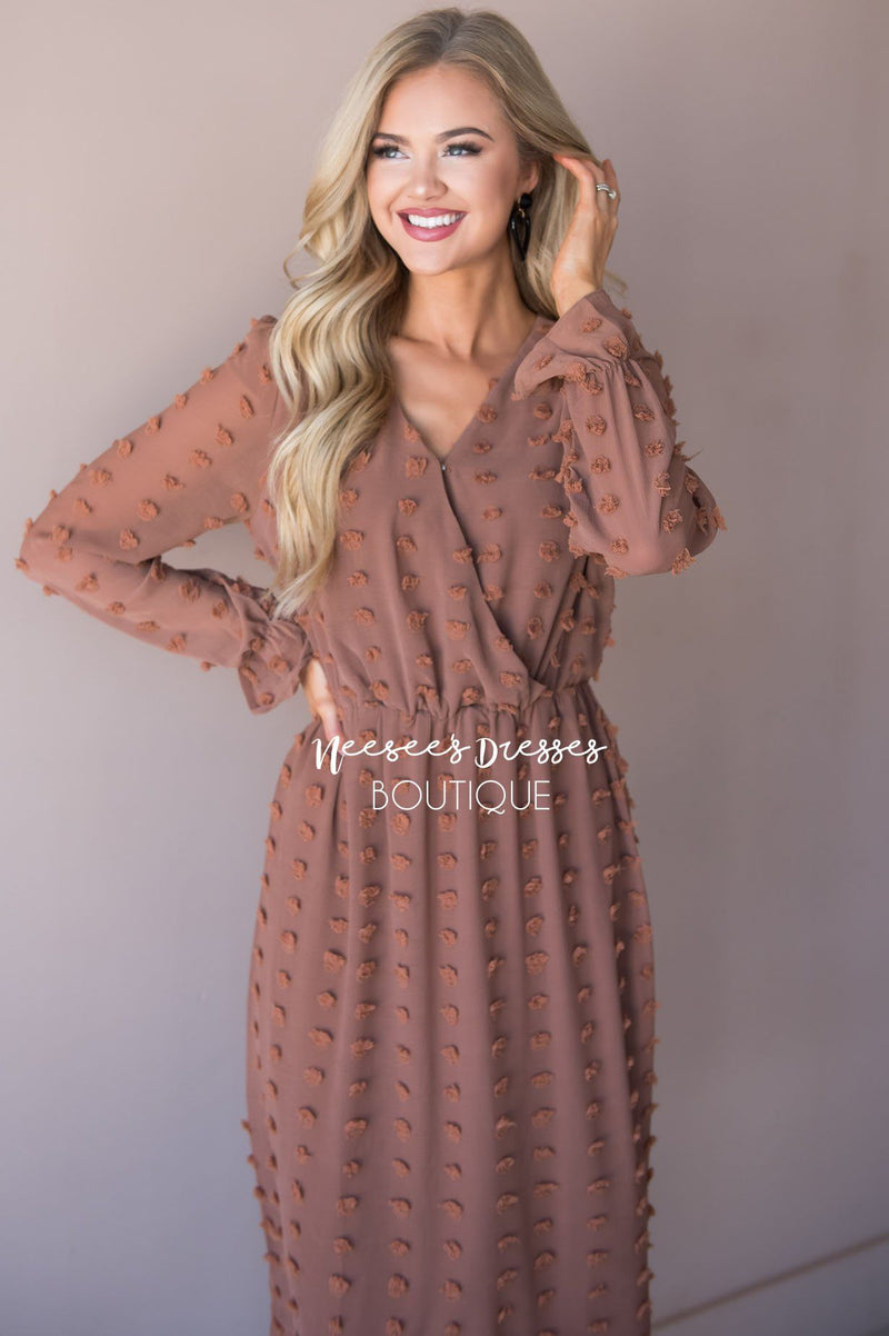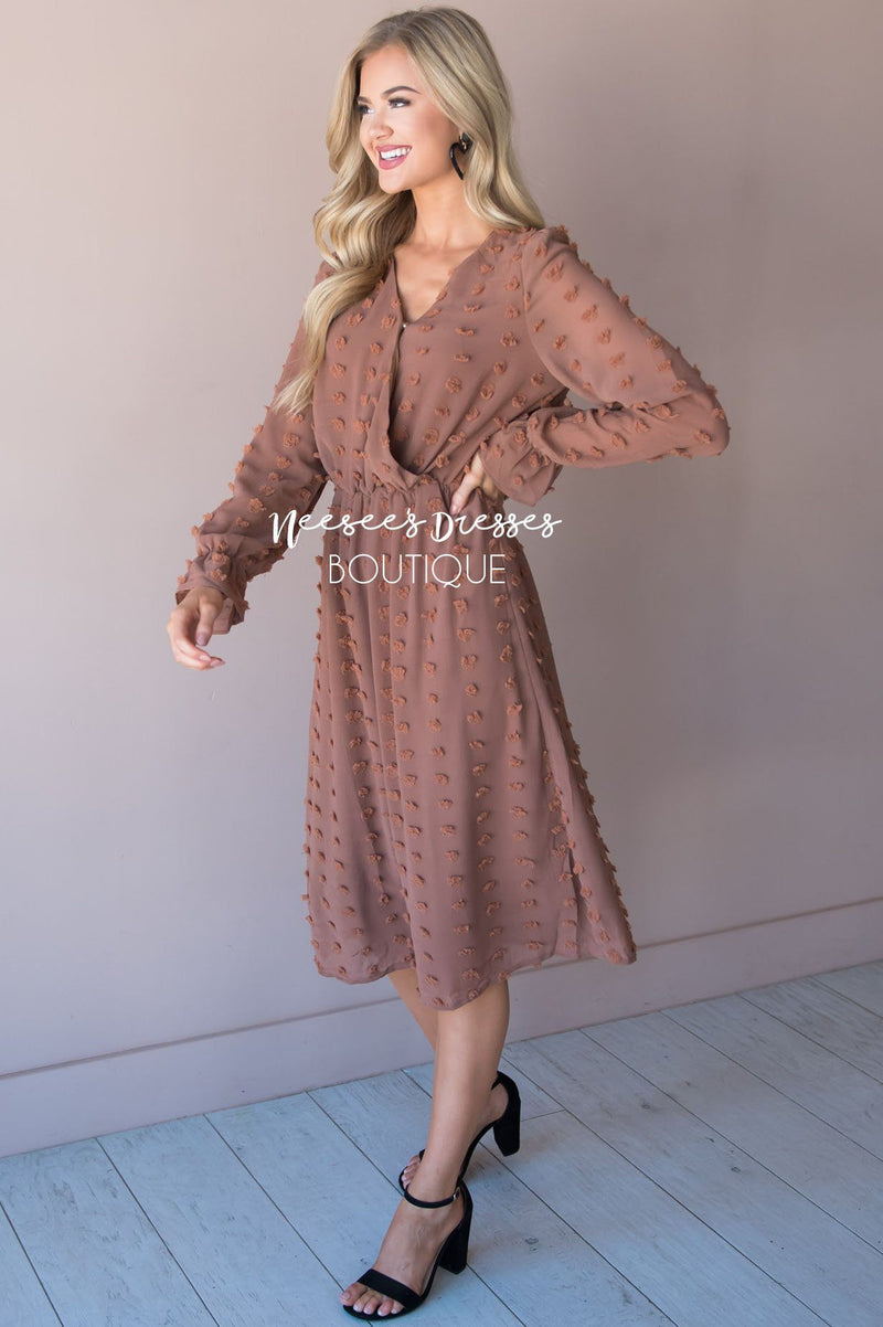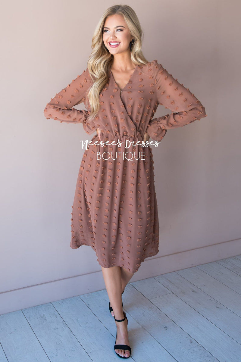 Our gorgeous Nikita will have you prepared for anything life has to throw at you! We are in love with the swiss dotting all over the dress, so unique, so cute and the rich new caramel color! Plus, how darling is the wrap bodice?! Perfect for nursing mommas! Other things to love include v-neckline, long sleeves, elastic waistband and it comes fully lined.