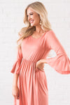You will have this beautiful dress for years to come and continue to grab for it again and again! It's so soft, gorgeous, feminine and comfortable too. The Ninah is a beautiful ruffle detailed dress that features 3/4 length bell sleeves and a gathered waist.