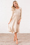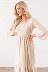 You will have this beautiful dress for years to come and continue to grab for it again and again! It's so soft, gorgeous, feminine and comfortable too. The Ninah is a beautiful ruffle detailed dress that features 3/4 length bell sleeves and a gathered waist.