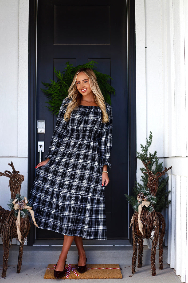 Kickstart your Winter wardrobe with the new Ninette! We simply adore the classy plaid material, elastic boat neckline, flattering elastic waistline, gorgeous long sleeves, tiered skirt and cozy slip on style for a comfortable fit. So simple yet so classy!