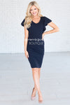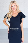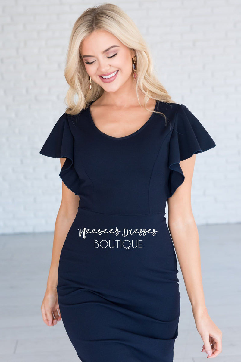 The Nixon has arrived just in time for all of your Spring and Summer time events! Perfect for church, attending weddings, bridal showers, you name it! You'll be right on trend with this classy modest pencil dress with the most feminine ruffle sleeve details! Also features a back zipper closure.
