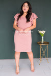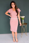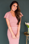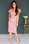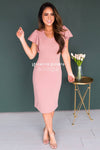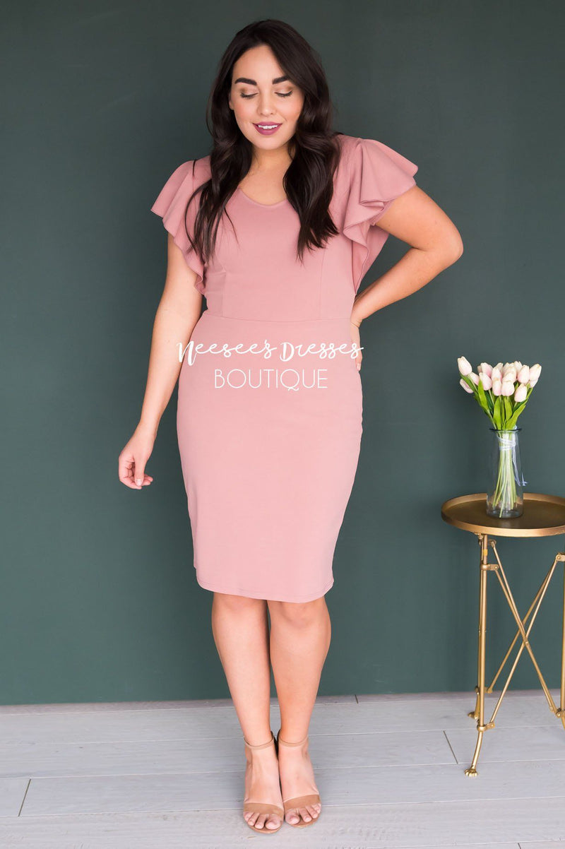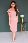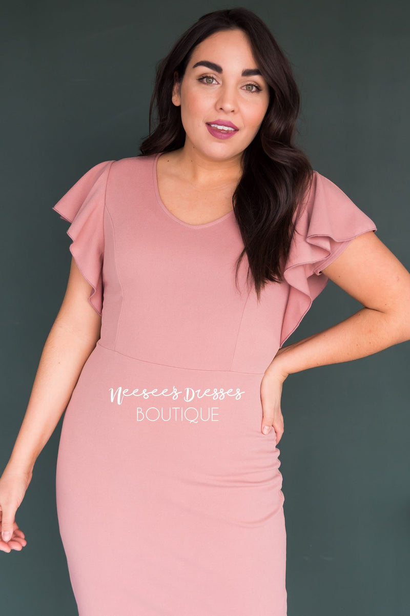 The Nixon has arrived just in time for all of your Spring and Summer time events! Perfect for church, attending weddings, bridal showers, you name it! You'll be right on trend with this classy modest pencil dress with the most feminine ruffle sleeve details! Also features a back zipper closure.