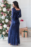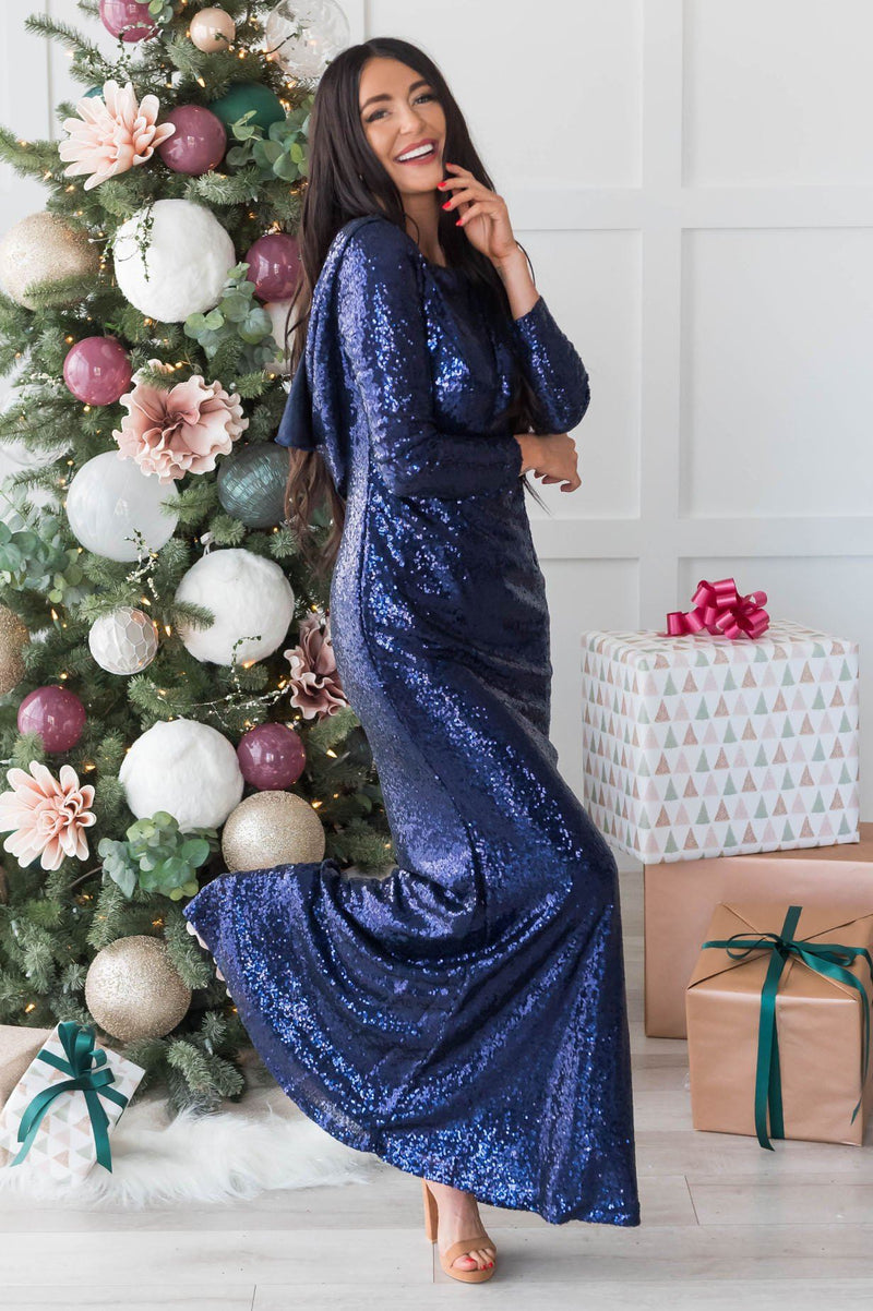 The anticipation is over! Say Hello to our new Noel gown. Your eyes aren't seeing things, this dress is stunning from every angle! This dress features long sleeves, high modest round neckline, draped back with silk insert, slim fit with flow! Gorgeous shiny sequins. We can go on and on about this one! These are limited quantity and will not be restocked so get yours today before they are gone.