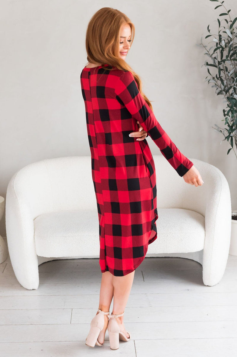 The darling soft Nori is fun and perfect for any season but we especially love it for Fall! Buffalo check is an absolute must have for every wardrobe! The lovely long sleeves, cozy soft material, pockets and flowy drop hem skirt are the the perfect combination. Get yours today!