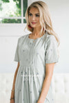 This pastel sage dress is a must have this fall! The Oaklynn features small embroidered dandelion floral print, a button front with pleated detail, a gathered waist and a ruffle hem skirt!