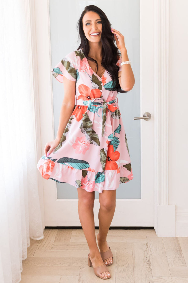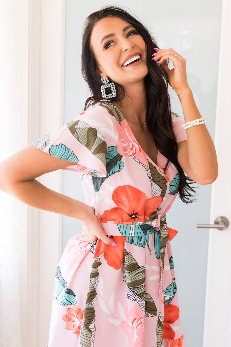 Say hello to the newest cutest dress you will ever own! This modest tropical floral midi dress is full of darling features! Soft v-neck with faux button bodice detailing, short flutter sleeves, and a lovely ruffle hem skirt. We are head over heels for this one and we know you will be too! Get yours today!