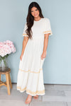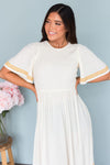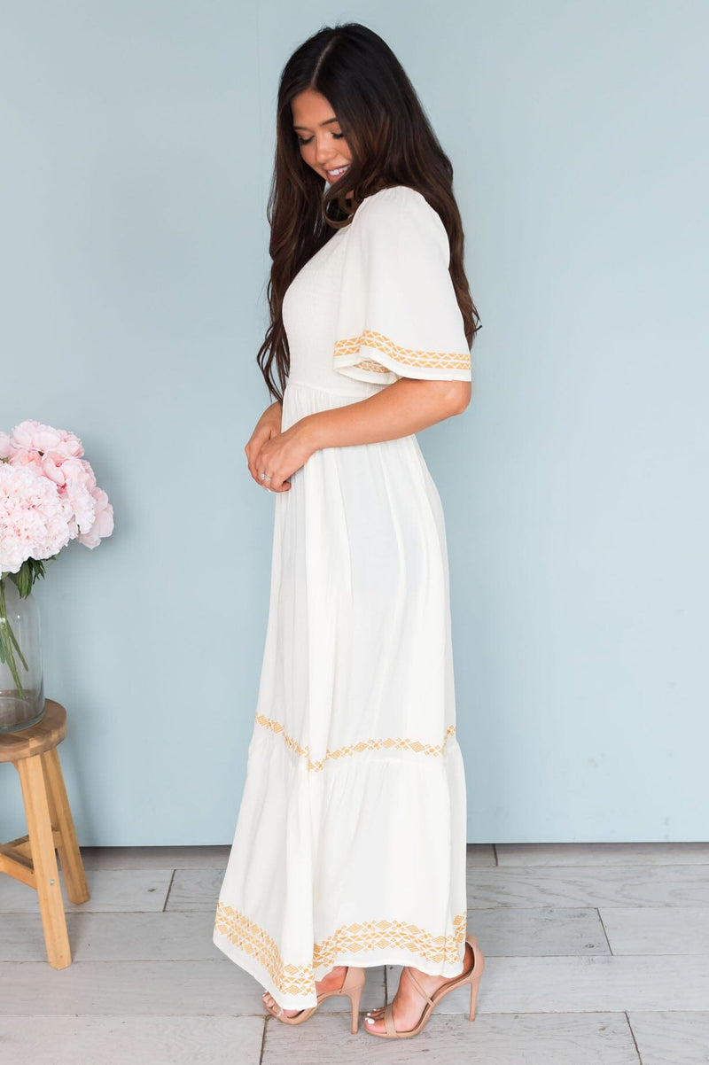 We are so excited to bring you the new Olive dress! This darling buttercream colored dress is bound to make an impact on your closet! Features include a modest round neckline, half length flutter sleeves, delicate embroidery detailing on the flowy skirt and sleeves, we simply can not get enough! Get yours today!