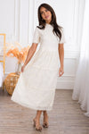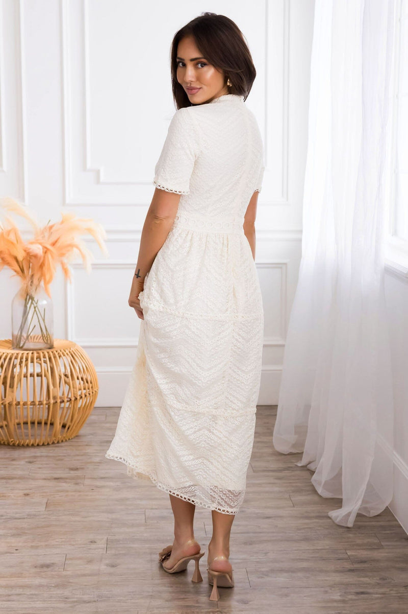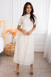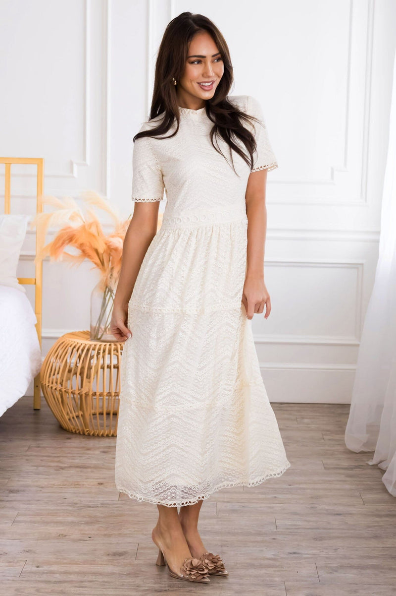 The Onna is an absolute favorite from our spring collection! The retro circle details and lace overlay combined create an elegant and classic style! We adore the modest collared neck and short sleeves too! It is radiant in everyway!