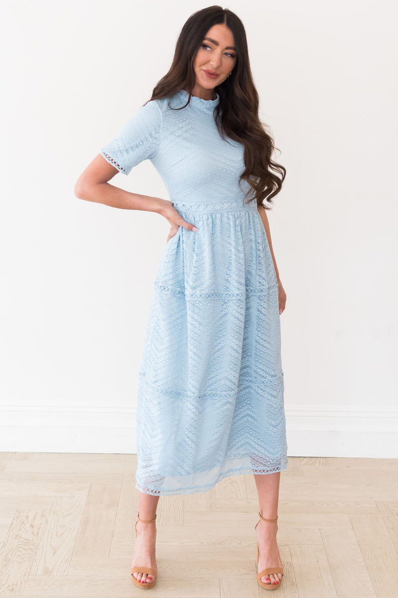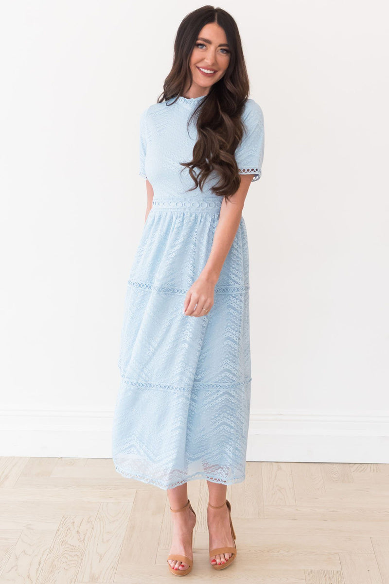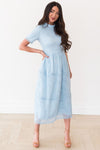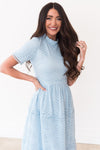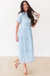The Onna is an absolute favorite from our spring collection! The retro circle details and lace overlay combined create an elegant and classic style! We adore the modest collared neck and short sleeves too! It is radiant in everyway!