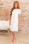 Summer is here and the Orielle is the perfect dress for it! Grab this lovely, eyelet embroidered dress for all your upcoming special events! Featuring a modest round neckline, short scalloped sleeves, side zipper closure and a feminine scalloped hem skirt.