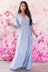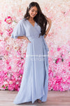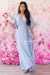 The classiest maxi dress you will ever find! Featuring the most gorgeous, elegant wrap style in the loveliest periwinkle color & half flutter sleeves! These will go quickly, add to cart now before they are gone for good!