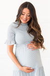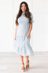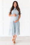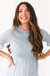 The darling Paola dress is here! This gorgeous dress has many amazing features, such as a smocked bodice and sleeves, half length sleeves with a shirred cuff hem, a ruffled high neckline, and a tiered skirt! Our Paola dress is a beautiful stone blue color, and also has swiss dot texture. You'll want to get this gorgeous dress for summer!