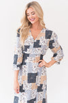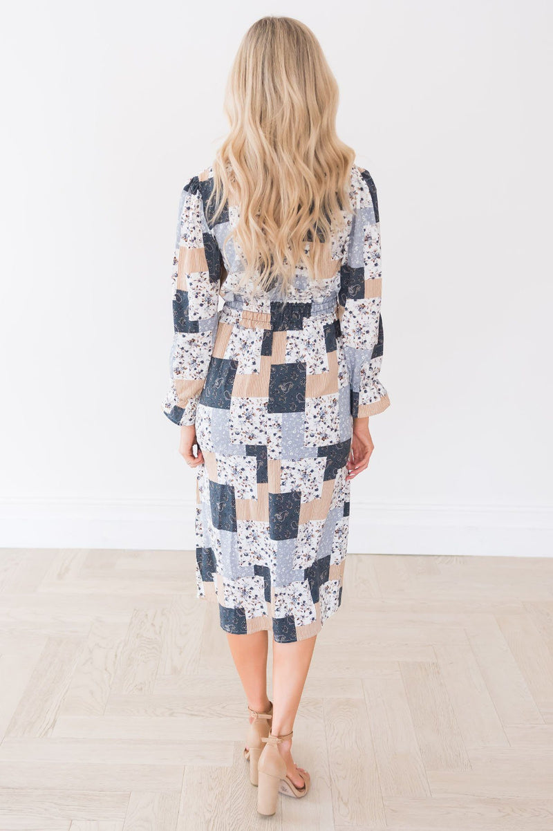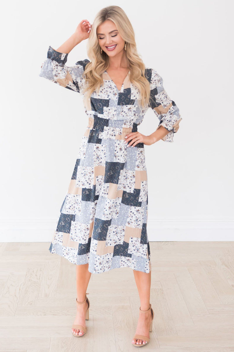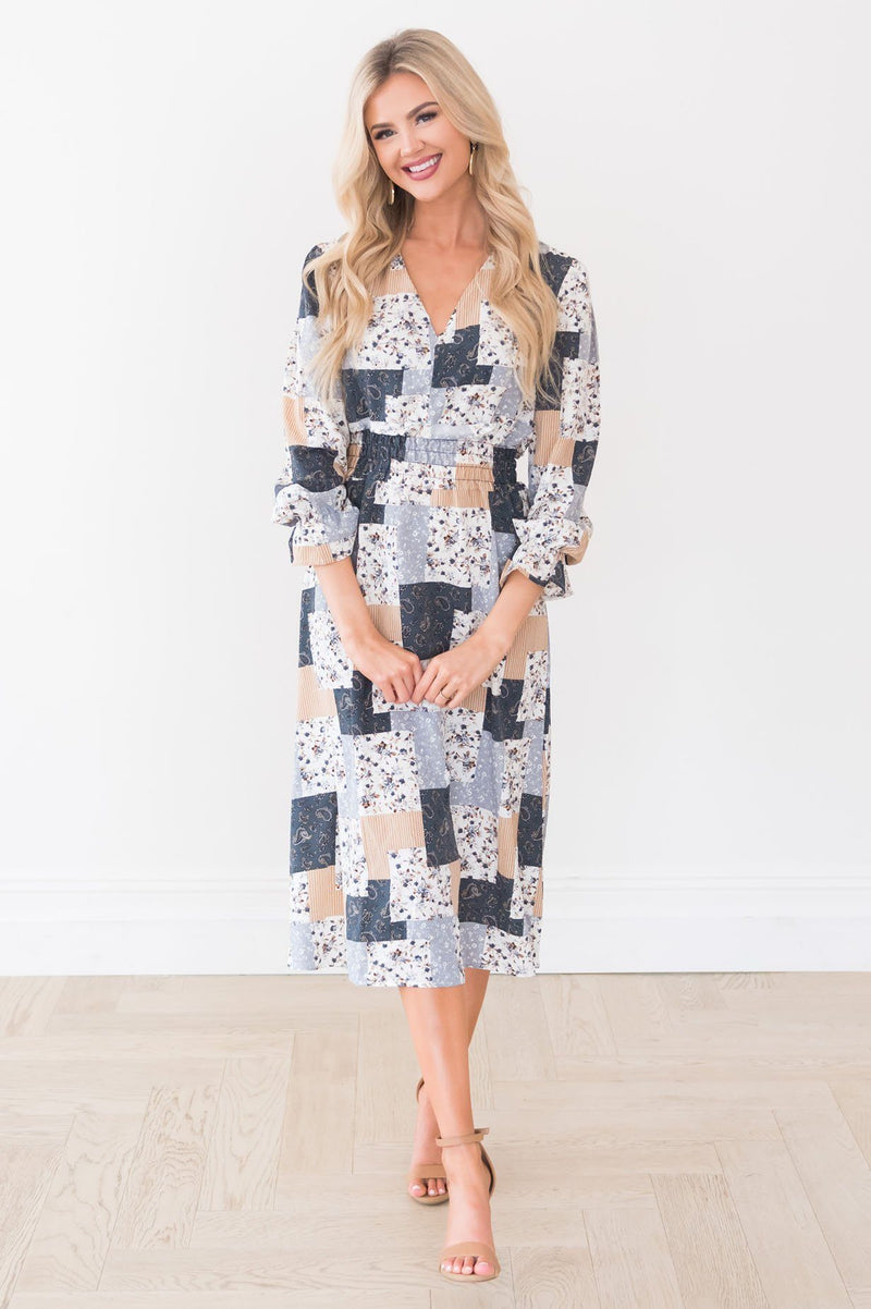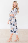 What a classy and fabulous dress to add to your wardrobe today! This creative floral block pattern is nothing short if perfect for any day of the year! We adore the ruched waist and ruffle detailing, along with the the long bell like sleeves!