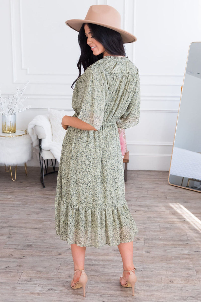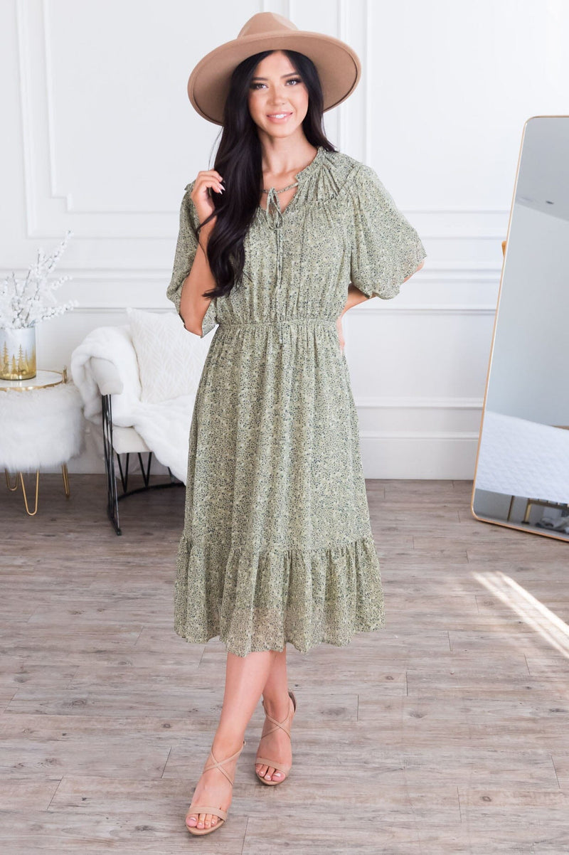 The Patti is stunning from the tie neckline detailing, shoulder ruffles and cinched waistline. We adore this green color and floral pattern together too! This simple, yet breathtaking dress is perfect this spring!