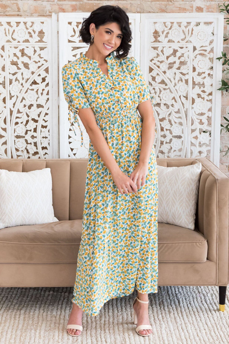 Say hello to the prettiest new spring dress! This modest maxi is perfect for all things summer, church, out to eat, and so much more. Available in four pretty florals, our Paylee features button and collared bodice, cute tie details on the short sleeves, and a flattering smocked waist. This dress is nursing friendly. We found steaming works great after taking it out of the packaging to release any wrinkles.