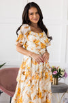 The darling frilly Petunia is a dream! This flowy little beauty is a must have for every wardrobe! Features include modest neckline, short flutter sleeves, flowy ruffle tiered skirt and a zipper back closure with tie detail. Get yours today!
