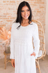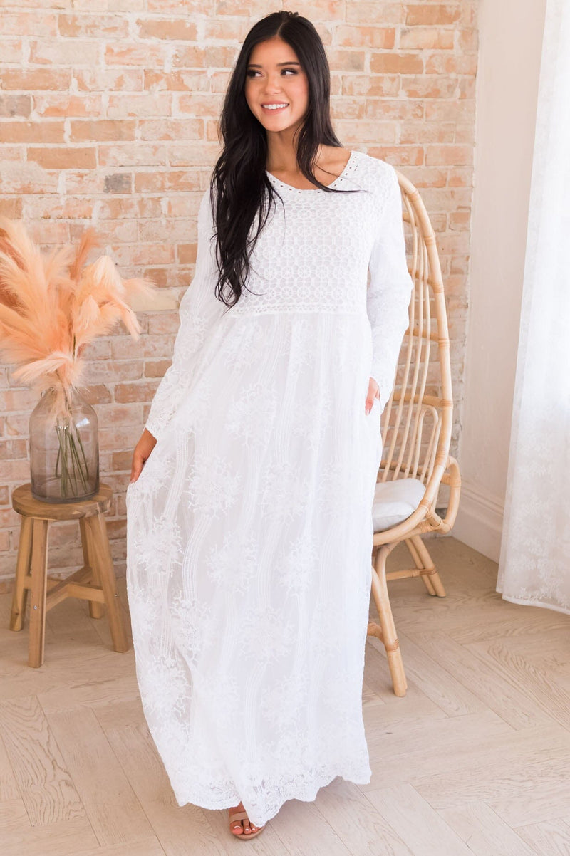 We were so excited to bring you all the new Precious! This dress is an absolute dream! This dress is so elegant, gorgeous and is here just in time to be your new Temple dress. Features include long sleeves, a lot of darling lace detailing, pockets and comes lined. Please trust us when we say these will go fast, order yours today!
