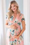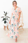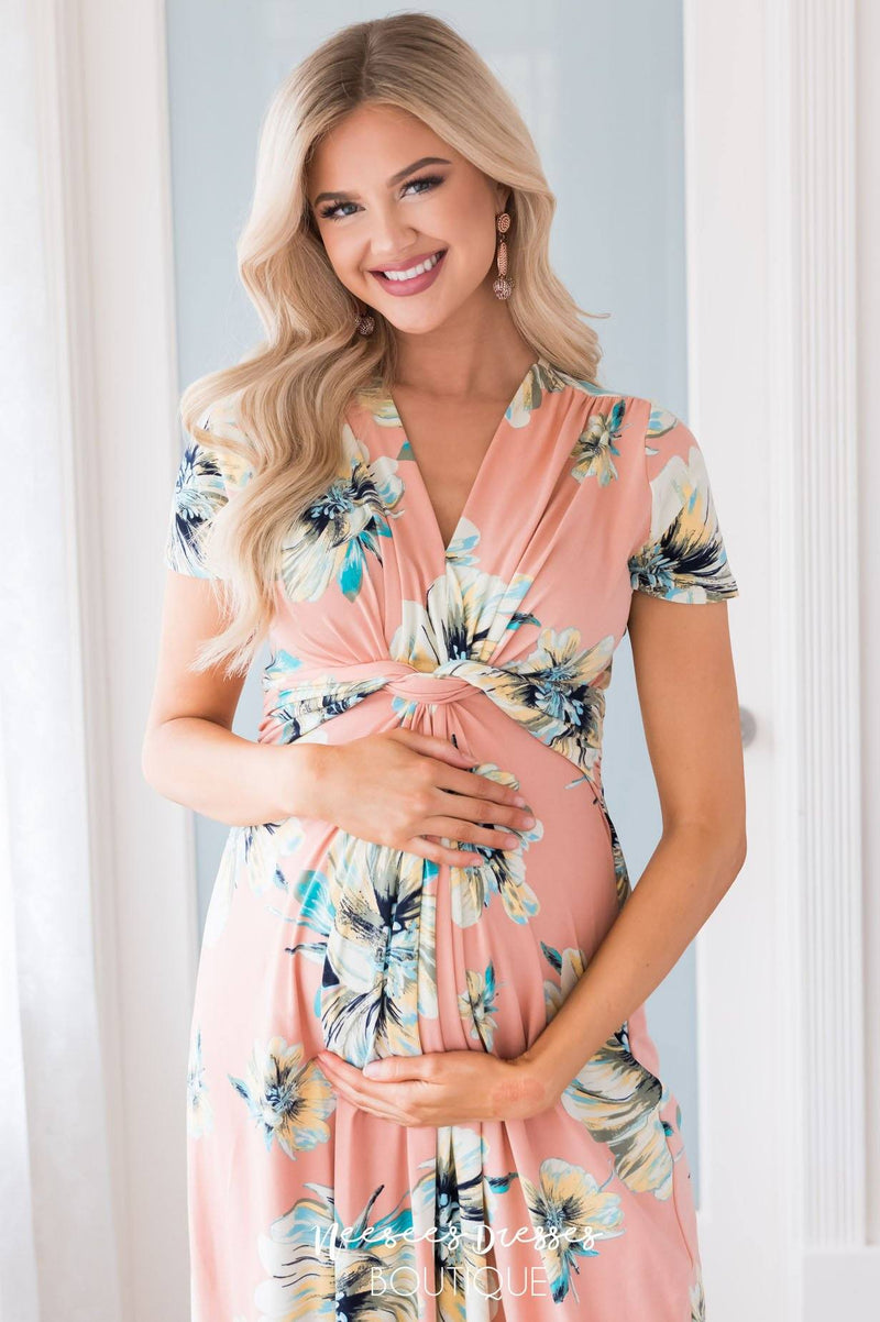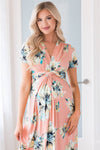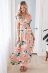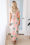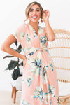How beautiful is this new full length dress, this sweet floral is the perfect way to take our favorite summer trend into breezy fall days! The front twist detail on this dress adds the perfect feminine touch! Peach dress features a lovely amaryllis floral print, a twist front detail bodice, a v neck line, short sleeves and a full length maxi skirt.