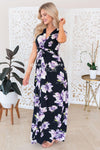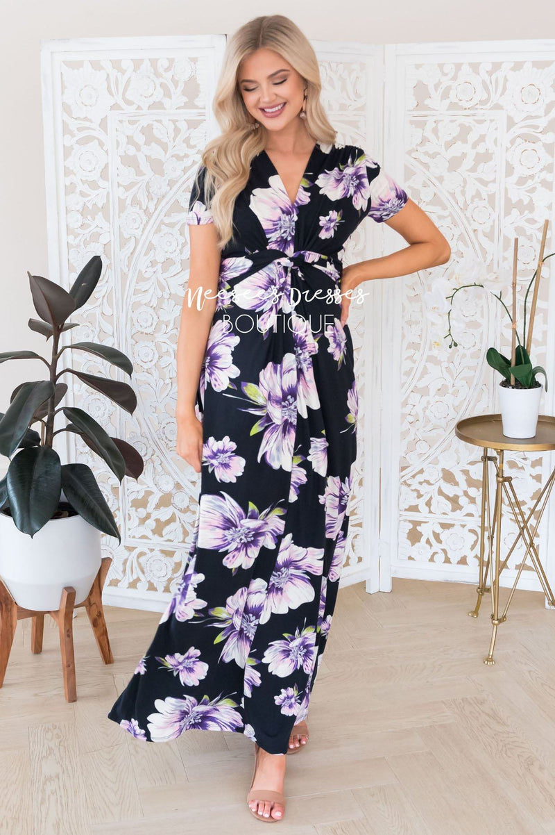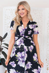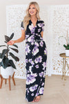 How beautiful is this new full length dress, this sweet floral is the perfect way to take our favorite summer trend into breezy fall days! The front twist detail on this dress adds the perfect feminine touch! Black dress features a lovely lavender/blush floral, a twist front detail bodice, a v neck line, short sleeves and a full length maxi skirt.