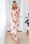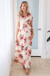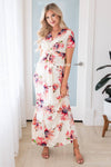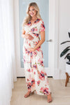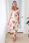 How beautiful is this new full length dress, this sweet floral is the perfect way to take our favorite summer trend into breezy fall days! The front twist detail on this dress adds the perfect feminine touch! Black dress features a lovely lavender/blush floral, a twist front detail bodice, a v neck line, short sleeves and a full length maxi skirt.