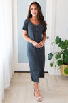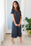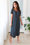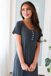 Allow us to introduce you to your new favorite dress, The Purity, is everything you could want in a dress and more! Featuring lovely flowy shift style dress, feminine charcoal color in a light weight airy material, perfect for layering, short sleeves & darling faux button detailing on the neckline. This is your next must have!
