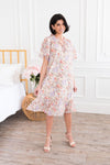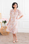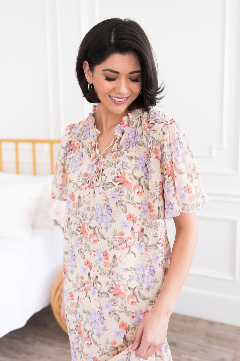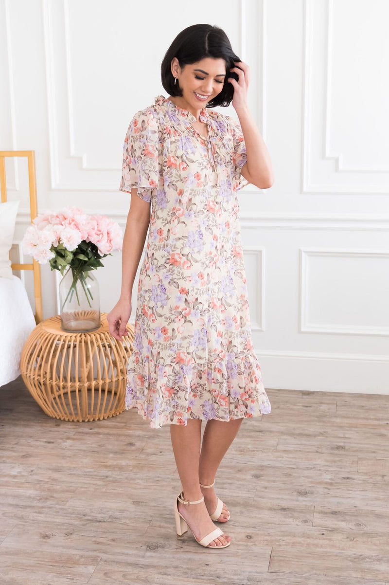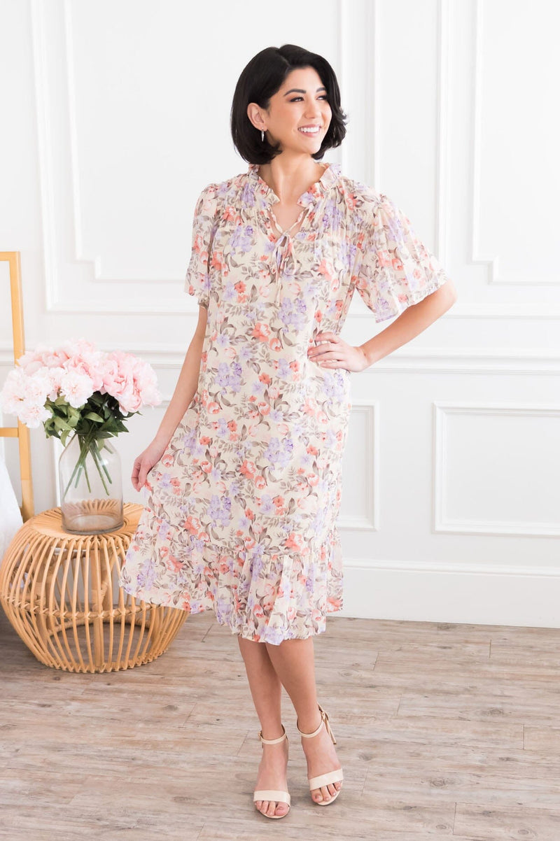 If you have been on search for the perfect Springtime dress, we have the one for you! Our new, modest, Quinne Dress, is so feminine and beautiful. Featuring a loose and flowy fit, a beautiful floral print, short flutter sleeves, and a ruffle neckline with neck tie detail.