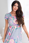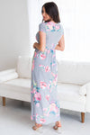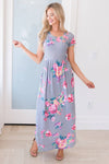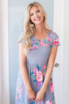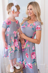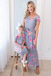 This soft charcoal color and the bright floral are the perfect duo! The floral includes bright shades of pink, purple, teal, green, yellow, and ivory! The maxi style, cap sleeves, and pleated waistline creates a modest and trendy design! This darling dress is perfect for any occasion and we can not get over the cuteness when paired with our little versions!