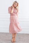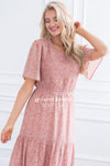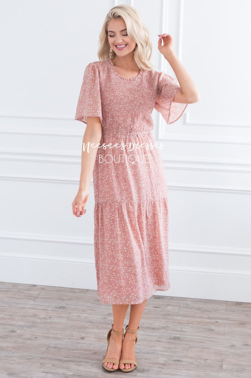The Raylee has got us excited! It truly has all of our favorite modest features in one gorgeous dress! Modest round neckline with a classy shirred bodice, unlined flutter sleeves, elastic ruffle waist detailing and a tiered flowy skirt! This one is a must have!