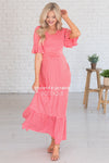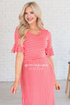 Talk about a classy darling maxi dress! The Raylene has arrived, this beautiful striped dress is a serious must have! Featuring modest round neckline, elastic waist, half length ruffle sleeves, pockets and the most gorgeous long ruffle hem skirt. Get your as soon as possible!