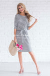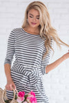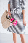Our secret is out, we cannot get enough stripes this season! The combination of these mocha and cream stripes is absolutely stunning! Featuring a relaxed pencil fit, a rounded neck line, 3/4 length sleeves and a self tie waist detail.