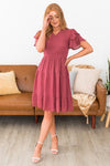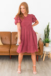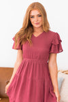 This fabulous dress is simply perfect for Fall! From the ruby wine color to the adorable flutter sleeves, we are seriously obsessed! This gorgeous dress also has a soft v-neckline, elastic waistline, and modest tiered skirt! You won't want to miss out on this stunning dress!