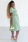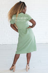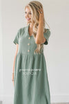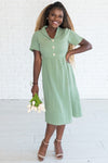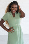 Beyond adorable! This sage dress features a textured fabric, a collar and faux button front.