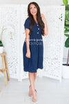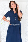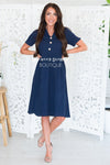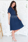 Beyond adorable! This navy dress features a textured fabric, a collar and faux button front.