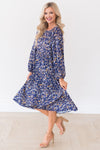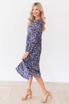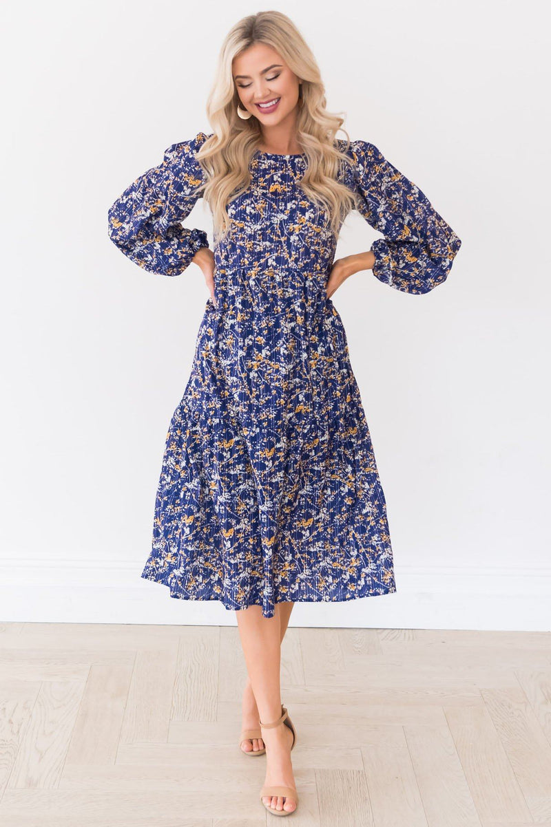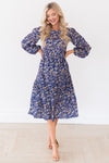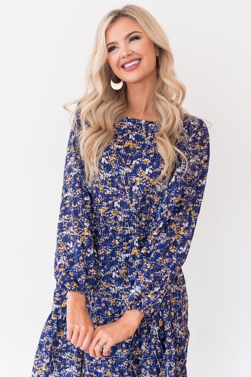 The perfect little tiered swing dress has arrived and trust us when we say these beauties will not last long! Features include a darling classic royal blue hue with abstract ivory/mustard print, long puff sleeves, tiered flowy shirt and button back closure. Get yours today!