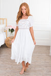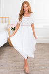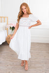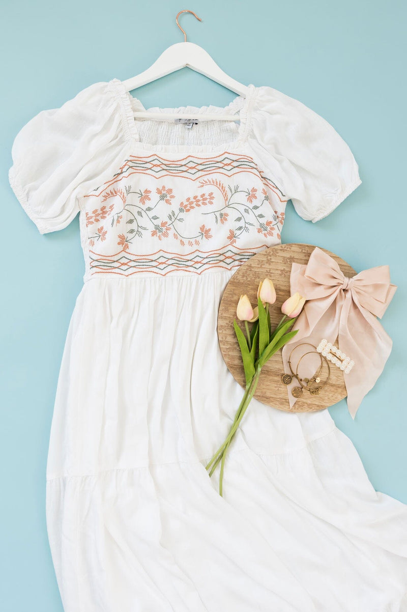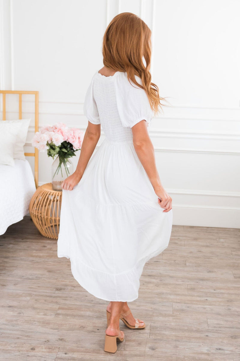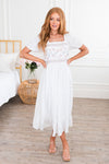 Meet our new, modest, Rico Dress. This dress will have you ready for all things Spring! Pretty as can be, this dress features a square neckline with ruffle trim, embroidery bodice, short puff sleeves, and a flowy tiered skirt.