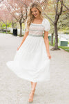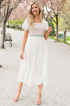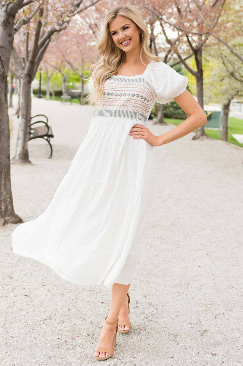 This gorgeous ivory tiered dress is so flowy and feminine; we simply can not get over it! We just love the beautiful rust and sage embroidery on the bodice, along with the short cap sleeves. This modest maxi dress is a must have for spring!