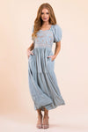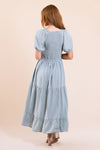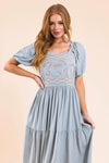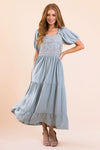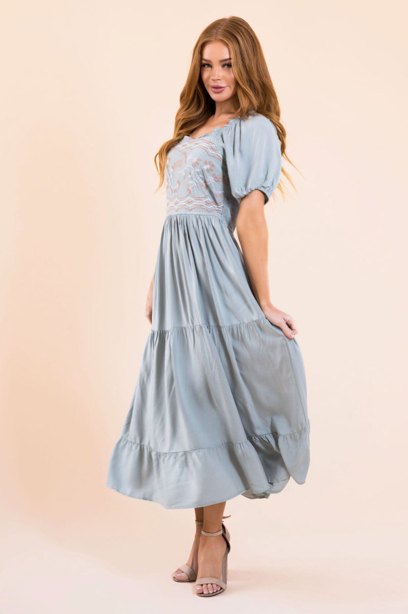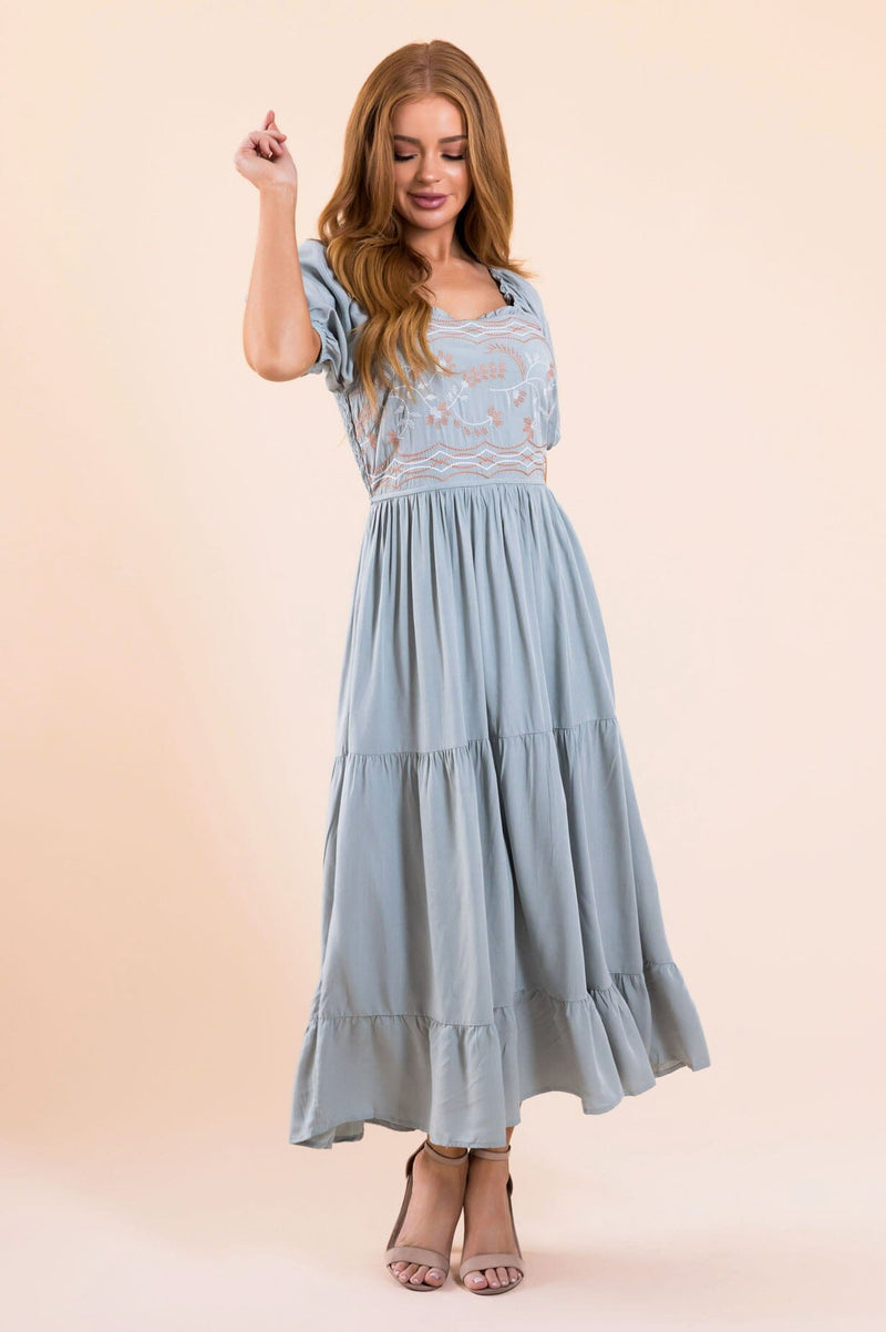 Meet our new, modest, Rico Dress. This dress will have you ready for all the things! Pretty as can be, this dress features a square neckline with ruffle trim, embroidery bodice, short puff sleeves, and a flowy tiered skirt.