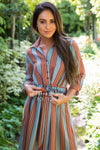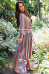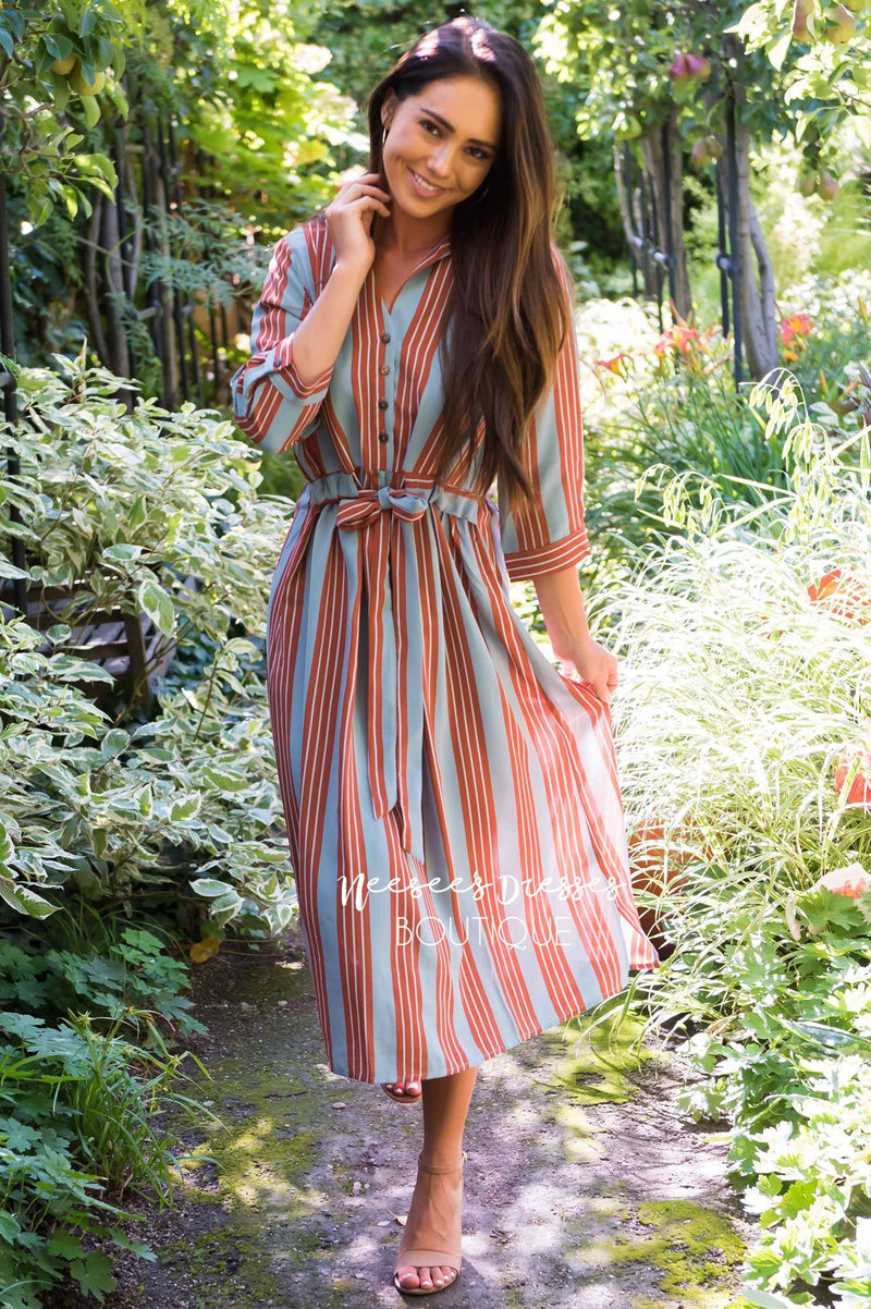We are getting all the fall feels with this new striped cutie! How darling are the buttons?! What's even better is that they are functional! YAY for all those nursing mothers out there! The Rikki features a collared v-neckline, 3/4 length sleeves and the most flattering scrunch tie waist belt detail! You are going to want this to be apart of your Fall wardrobe!