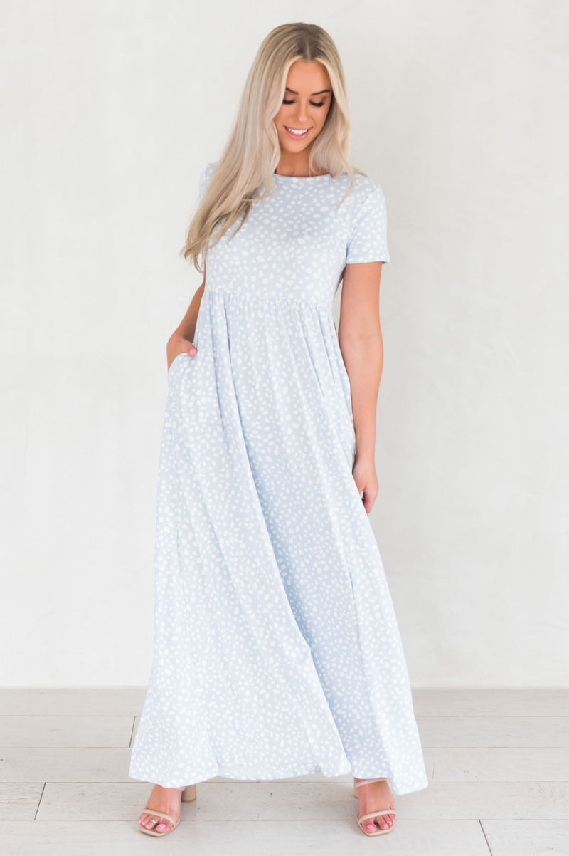 We love to share our love for maxi dresses with all of you! That's why we our giving the gift of maxi galore! This beauty features gorgeous light blue color with darling white leopard print, short sleeves, round modest neckline, and of course pockets, don't forget the most softest material EVER!