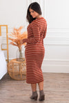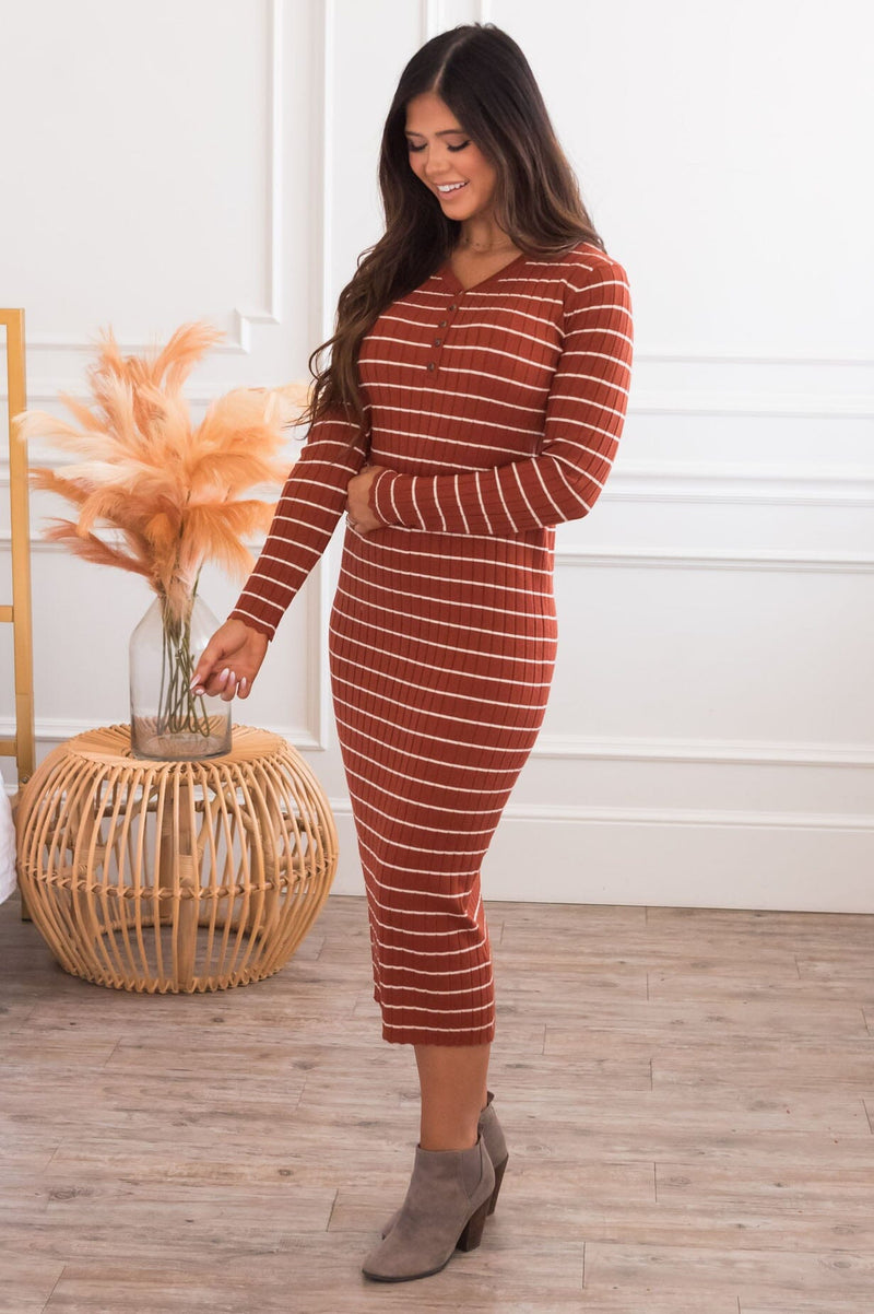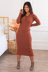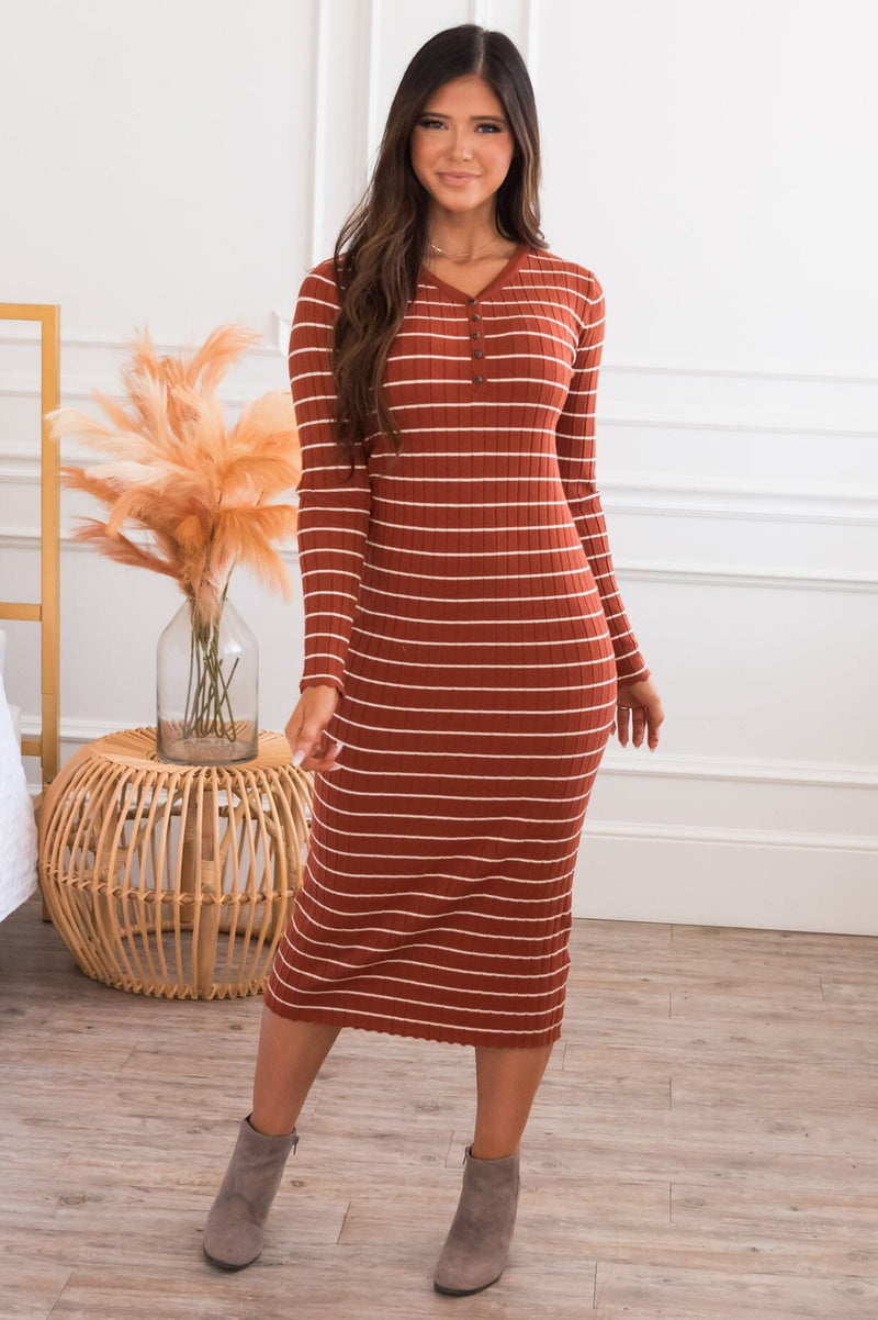 The Robin is the most gorgeous sweater dress we've ever seen! Featuring a gorgeous rust color, ivory stripes, a button up bodice that makes this nursing friendly, super soft sweater material, long sleeves, and lettuce edge hems! Make sure to get yours soon!