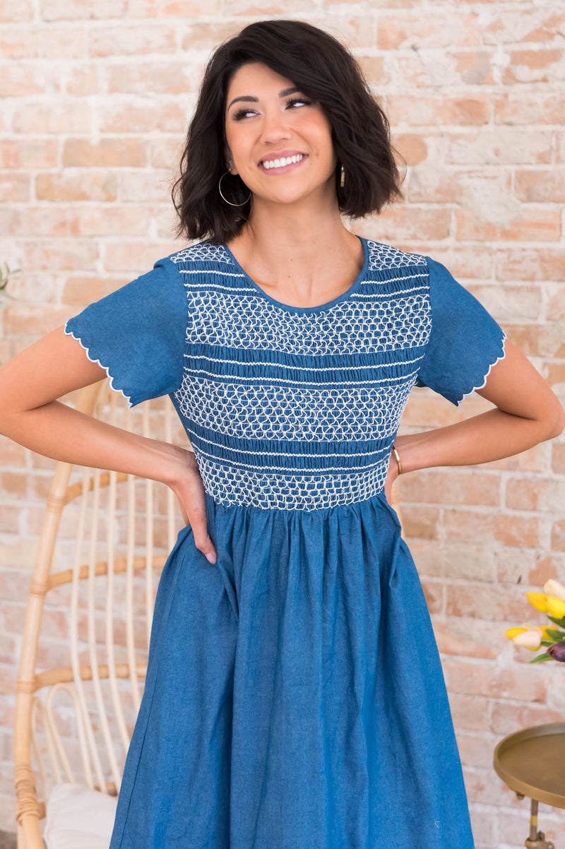 The Rochel is the next perfect embroidered dress you need! With amazing features such as the perfect for spring and summer short ruffle edge sleeves, delicate embroidery detailing throughout and perfect modest length skirt! You simply can not go wrong, get yours today!