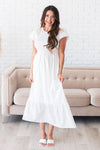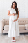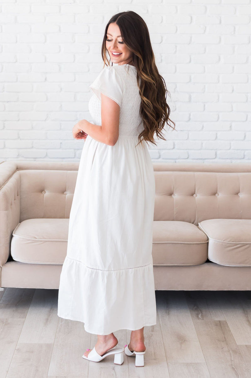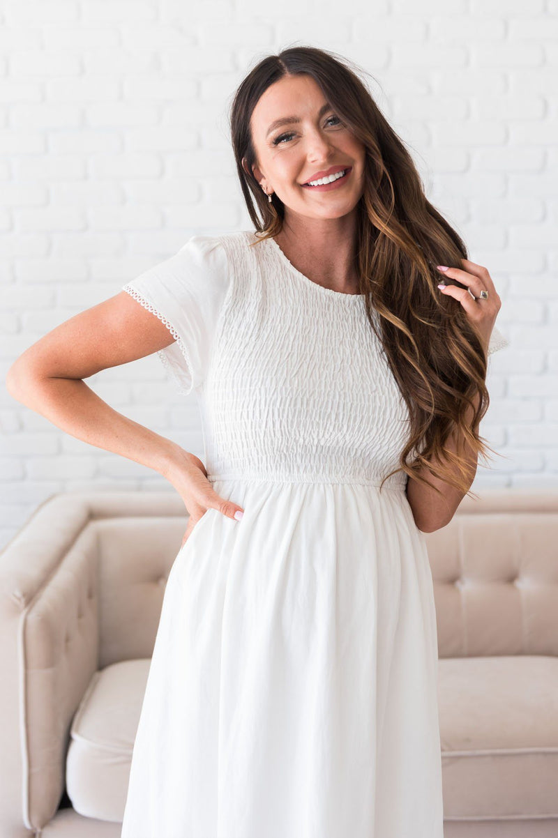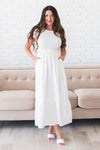 Wow! Welcome our gorgeous new Rosalia Maxi Dress! This beautiful cloud white dress has so many stunning features, such as a high rounded neckline, an elastic waist, short cap sleeves with embroidered detailing on the hem, and a gorgeous smocked bodice! This dress is a must have!