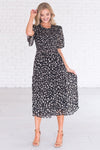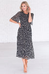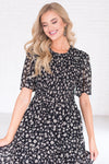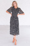 This, flowy floral beauty called the Rosalina had us hooked at hello! We love the delicate floral print, short flutter sleeves, shirred bodice, high modest ruffle neckline and tiered skirt. Trust us, this beauty is must have for every wardrobe!